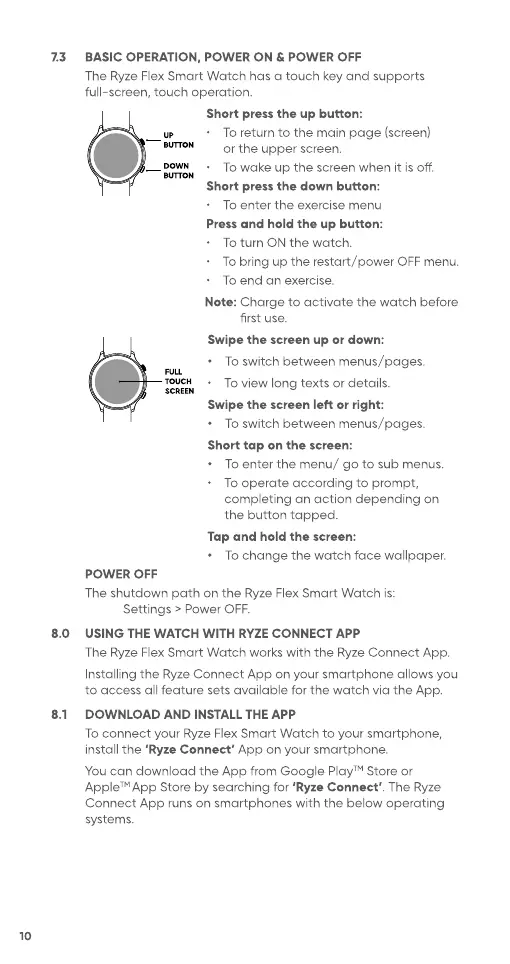 Directed Ryze Flex - Basic Operation and App Integration; Basic Operation, Power On & Power Off; Using the Watch with Ryze Connect App; Download and Install the App