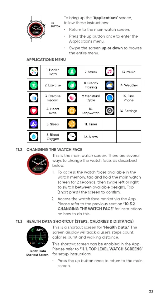 Directed Ryze Flex - Watch Interface and Data Shortcuts; Changing the Watch Face; Health Data Shortcut (Steps, Calories & Distance)
