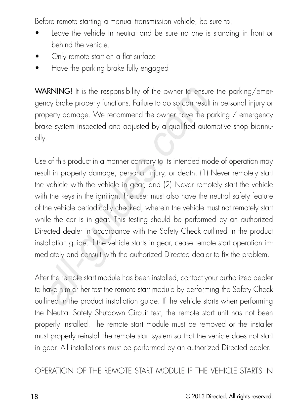 installation guide. If the vehicle starts in gear, cease remote start operation im-