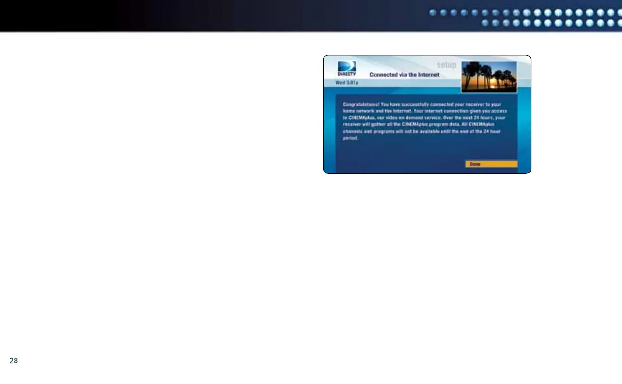 Please allow up to 48 hours for all of the DIRECTV CINEMAplus content to be downloaded onto your DIRECTV Receiver. You now have access