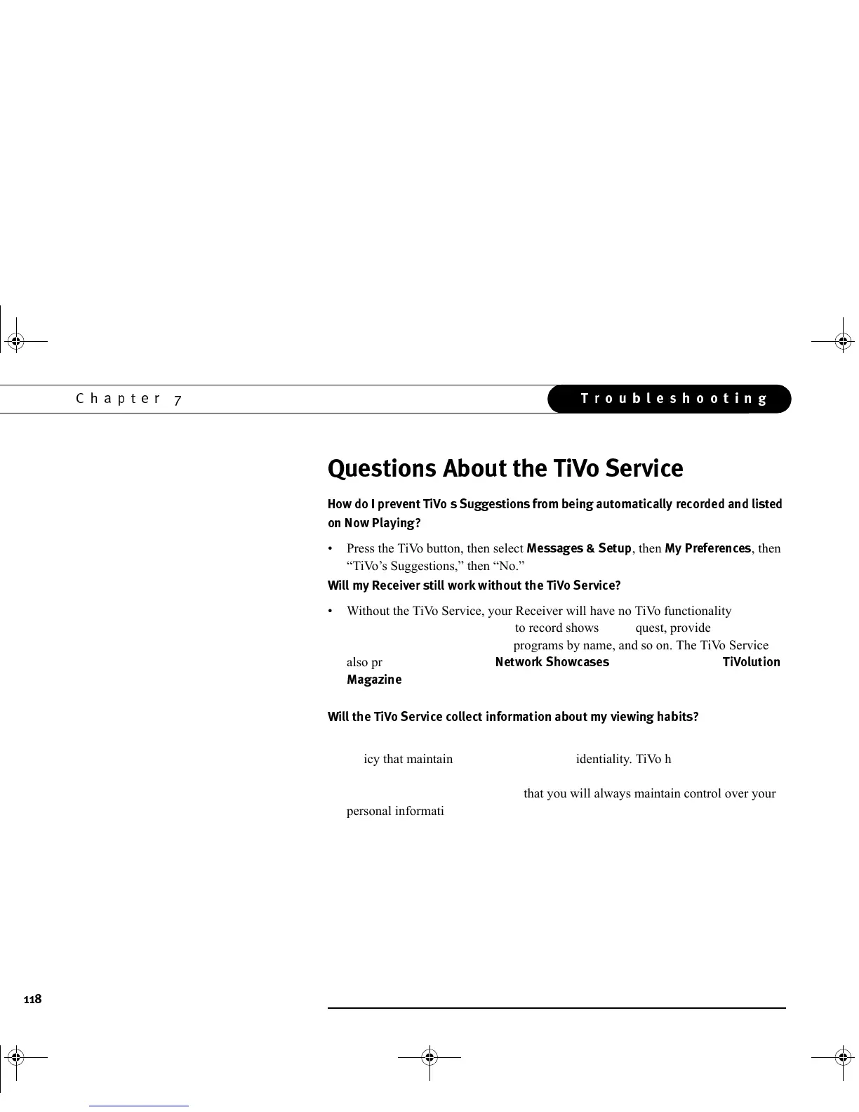 • Without the TiVo Service, your Receiver will have no TiVo functionality. The