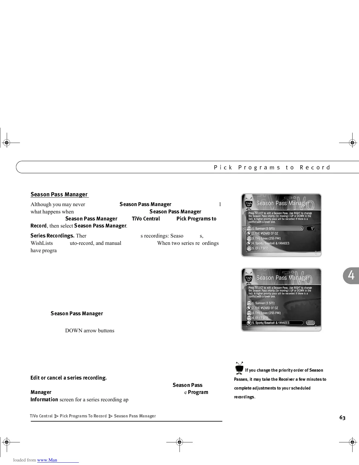 • Use the UP/DOWN arrow buttons on the remote to move the selected Season Pass