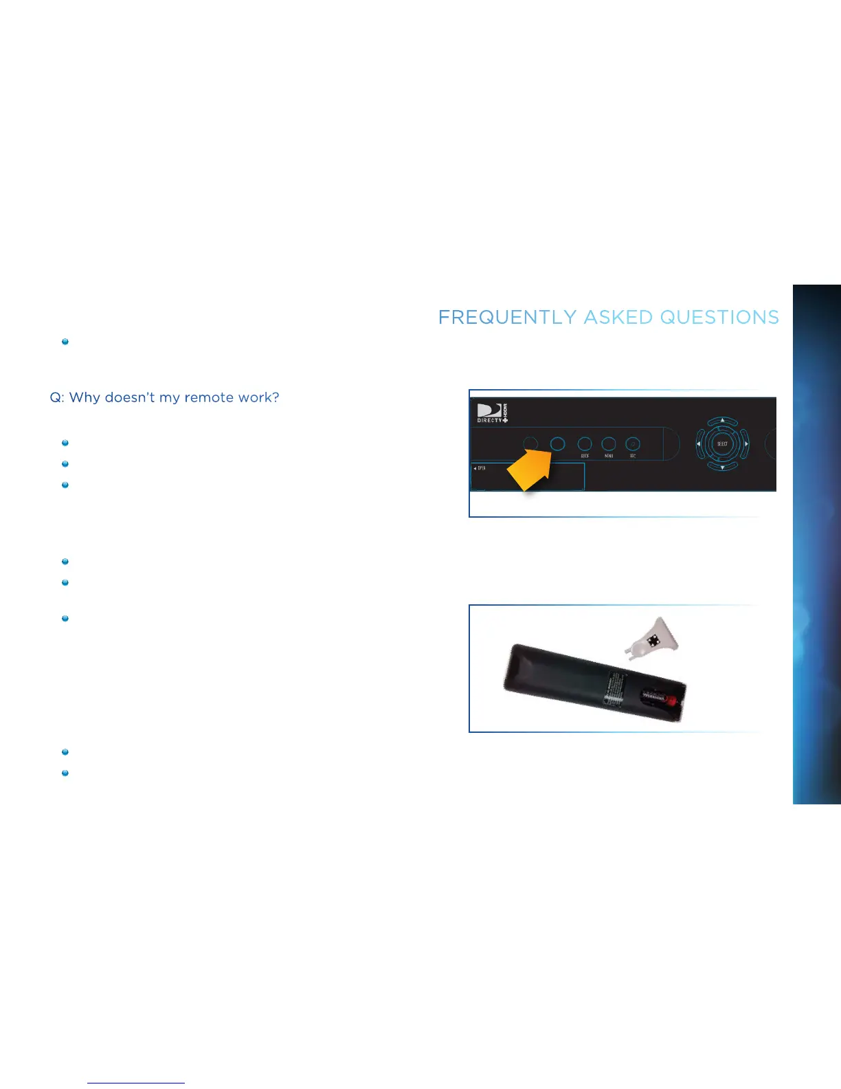 Make sure the Remote is in DIRECTV mode. Slide the MODE switch on the Remote to the DIRECTV position so the Remote will