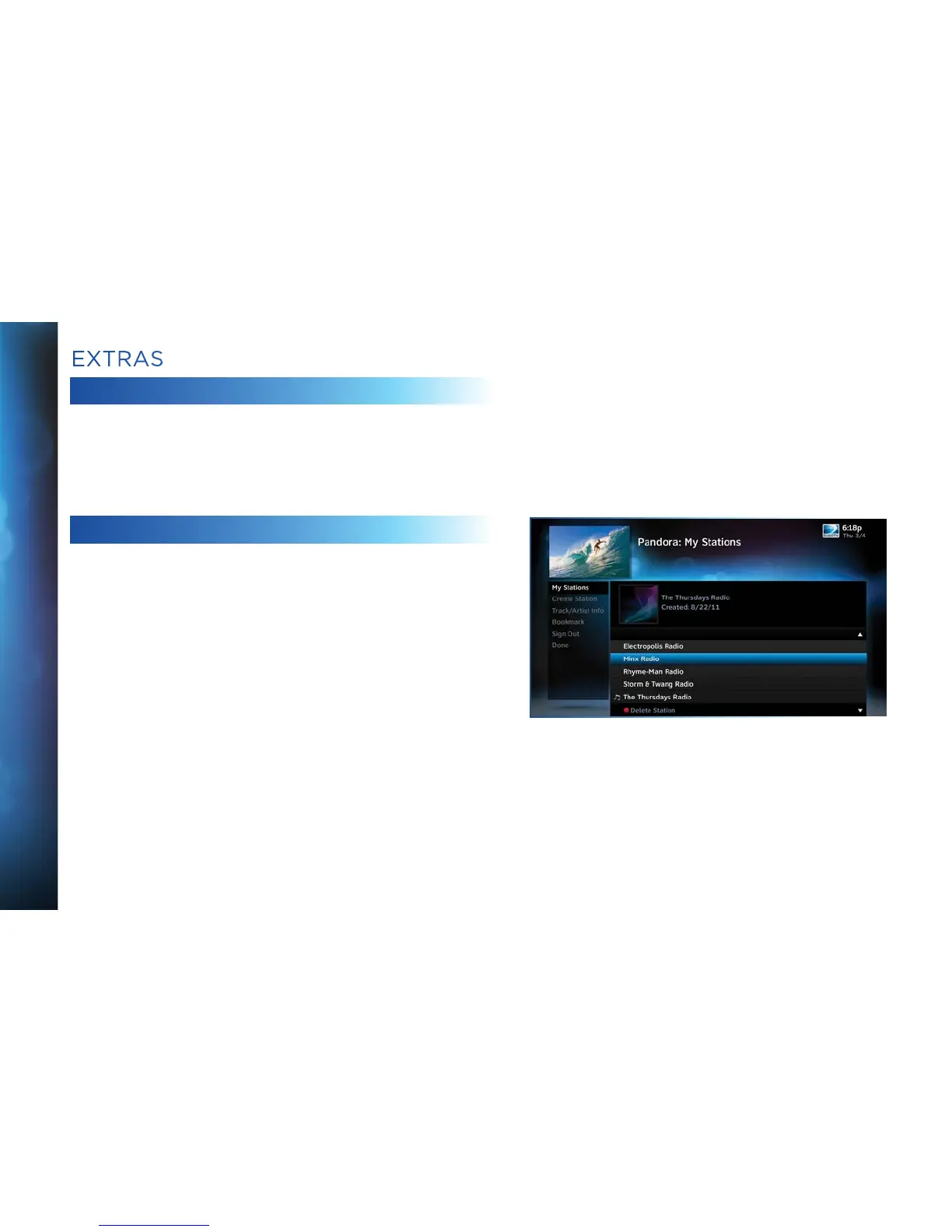access Pandora, press MENU on your remote. Select Extras then