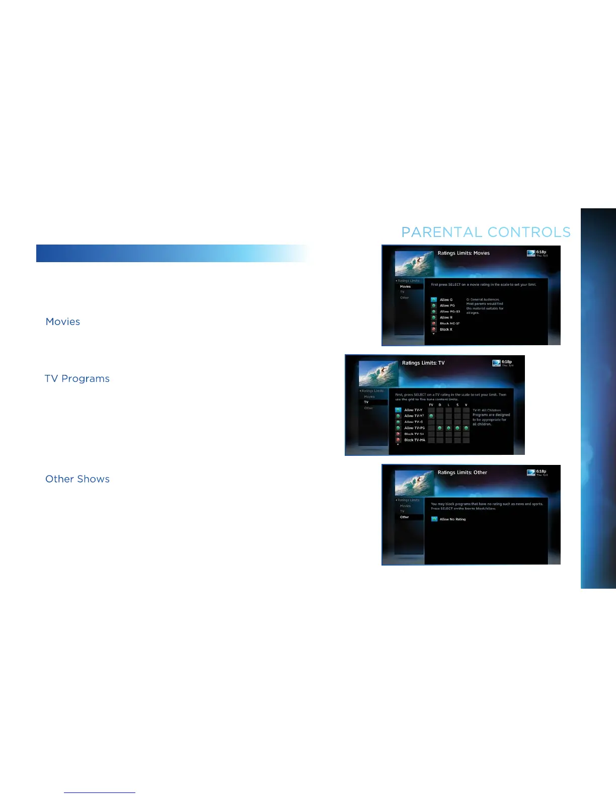 can also set ratings limits for particular types of content such