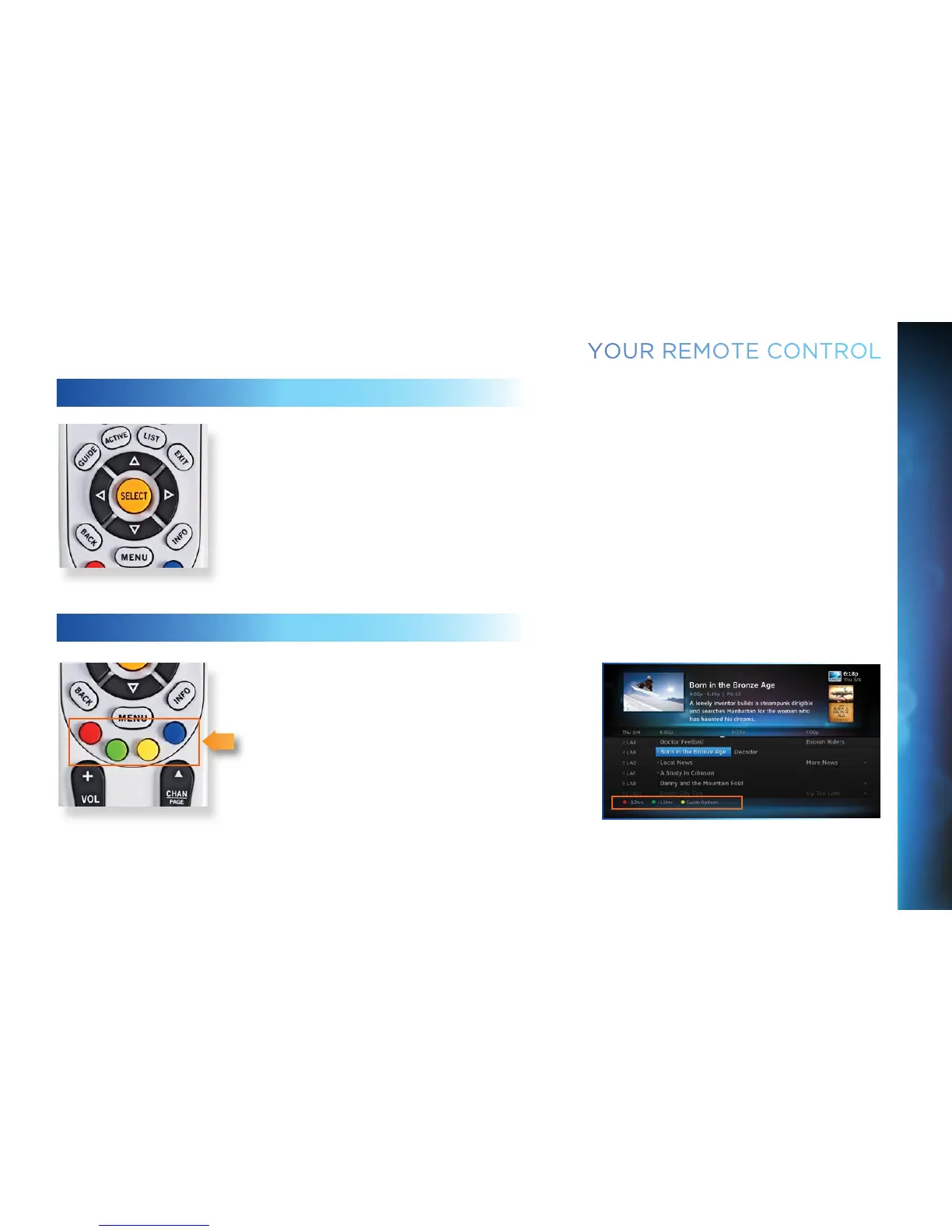 and return to live TV. Use the ARROW buttons and SELECT button to navigate though the guide or any
