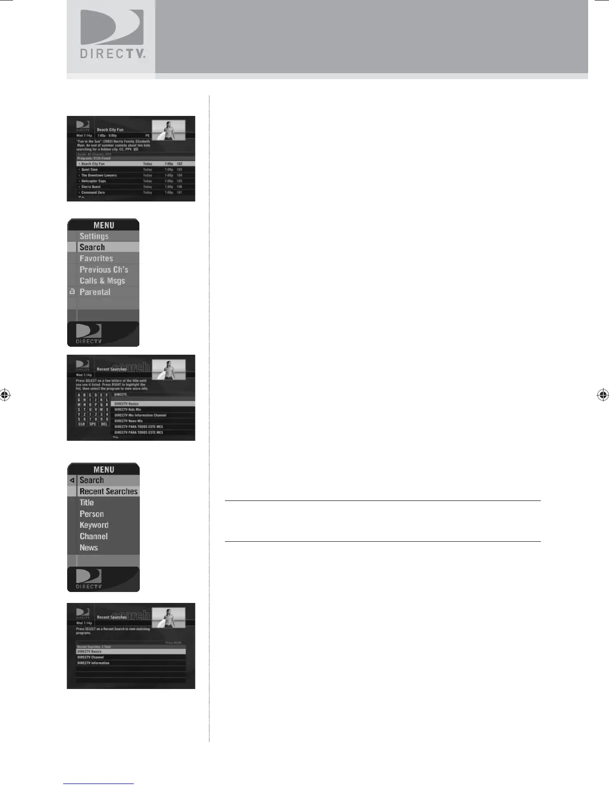 Press MENU, then select Search. You can fi nd a program by Title, Person,