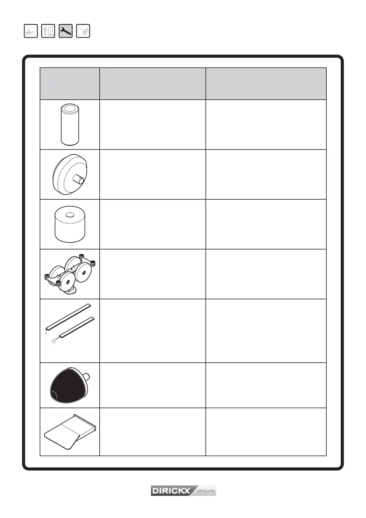 DIRICKX ALLIANCE PLUS - Spare Parts List; Rollers, Wheels, and Stops; Sensitive Edges and Blocks