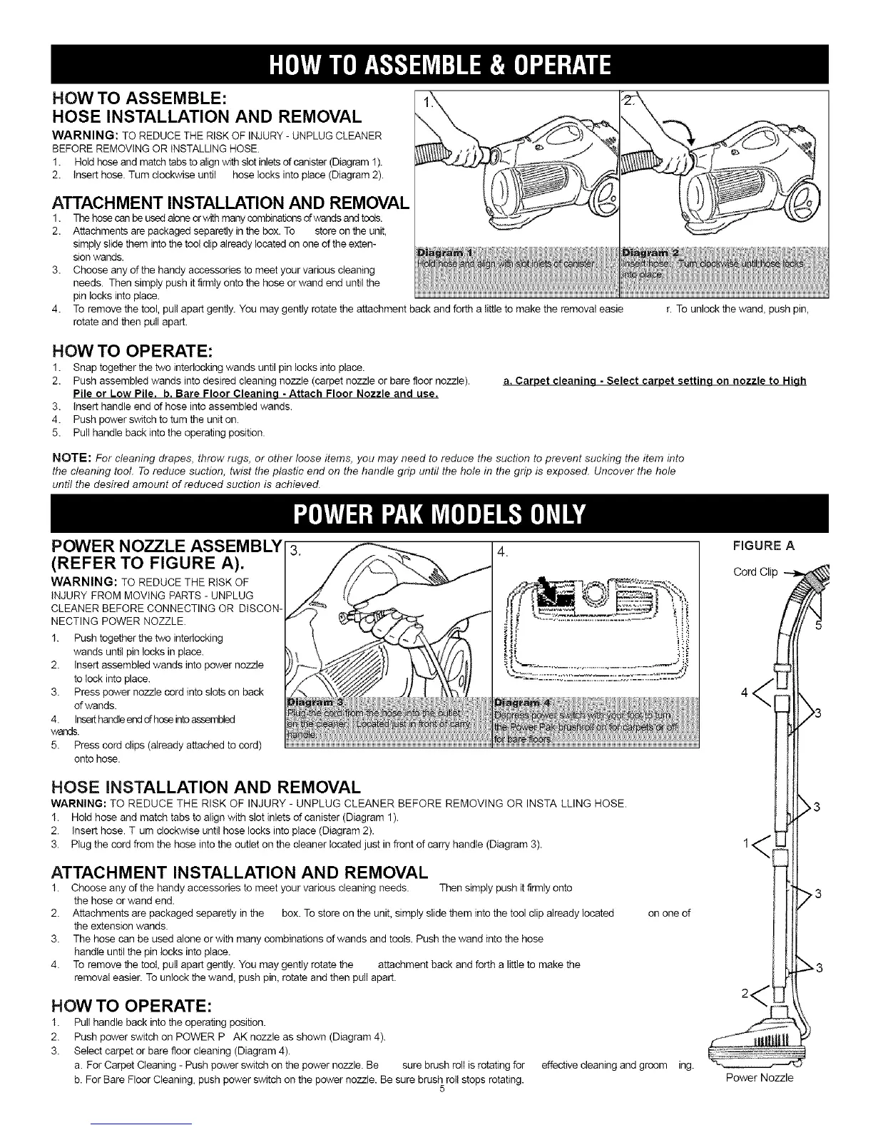 WARNING: TO REDUCE THE RISK OF INJURY - UNPLUG CLEANER BEFORE REMOVING OR INSTALLING HOSE.