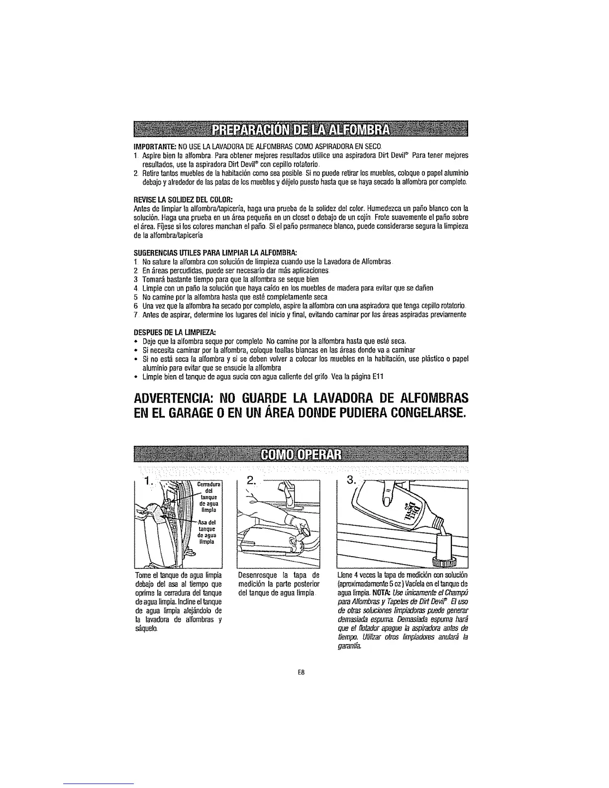 Antesde lirnpiarla a!fombra/bpiceria, haga unaprueba de[asolidez del color,Hurnedezcaun patio btancocon la