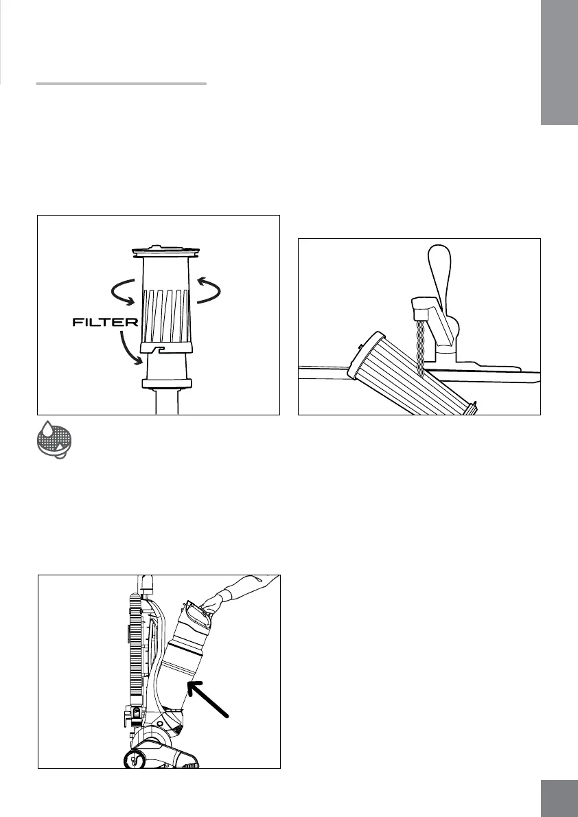 REGULAR MAINTENANCE: Each time the dirt cup is emptied, the filter should be cleaned. Tap the filter firmly
