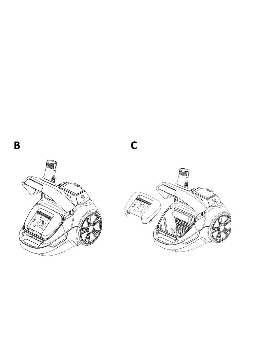 Dopo aver svuotato il contenitore della polvere nel cestino dei riuti (C)