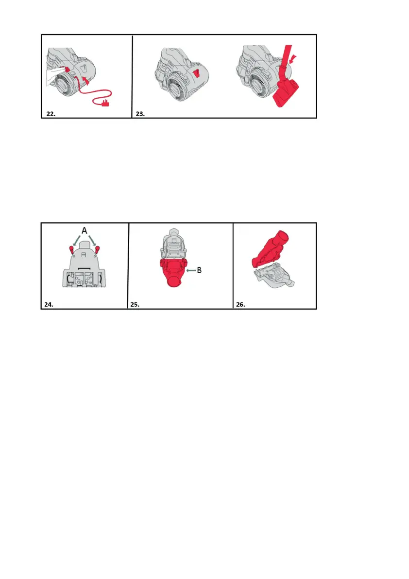 25. Ta bort bottenkåpan (B). Rensa bort skräp eller hår från