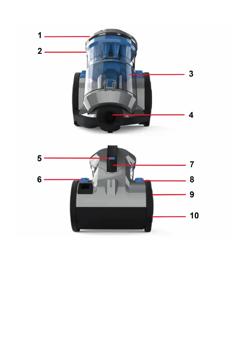 5. Behälter-Entriegelungstaste 10. Innenrad und Filtergehäuse
