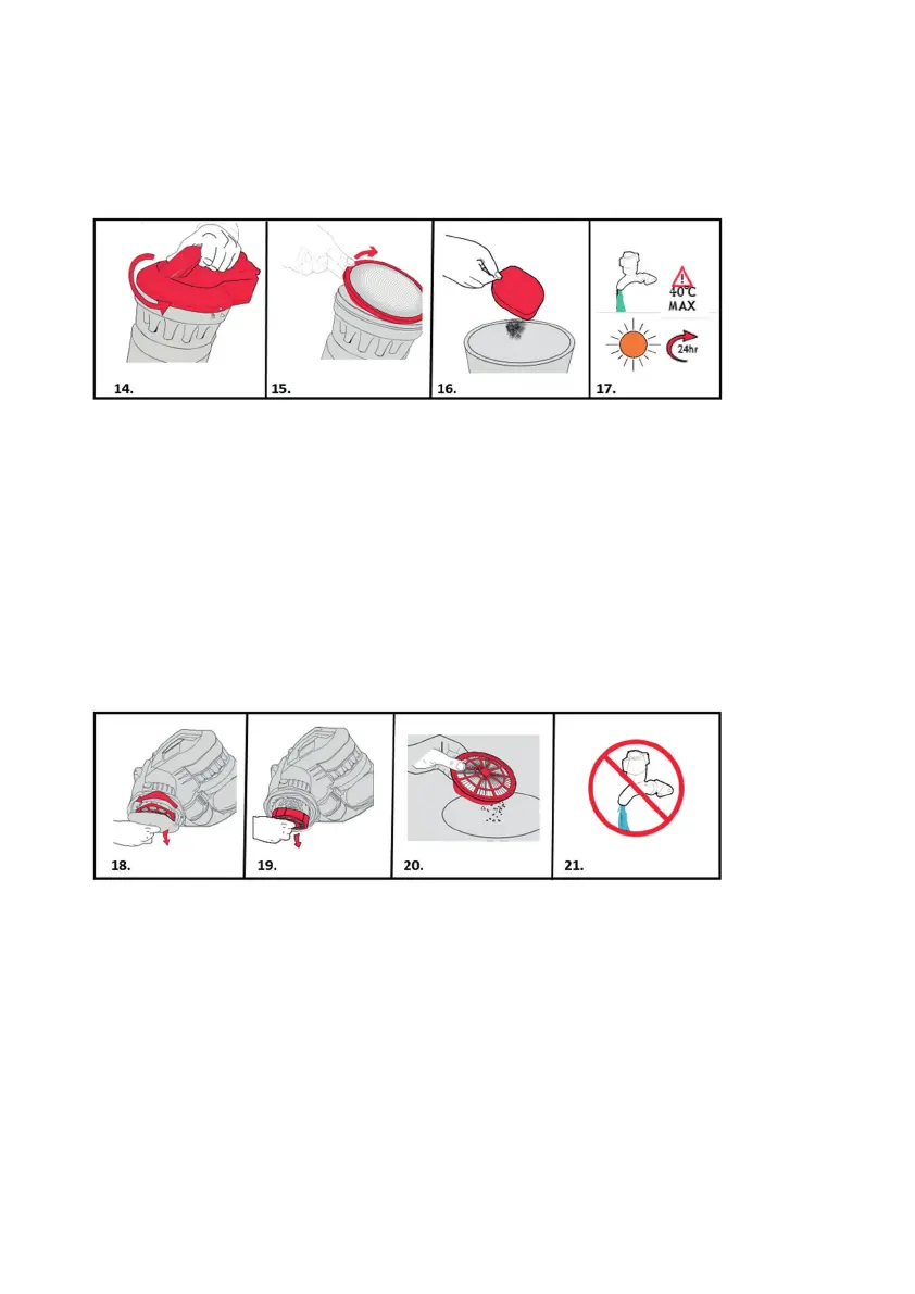 17. Clătiți ltrul sub jet de apă (40°C Max). Lăsați-l să se usuce
