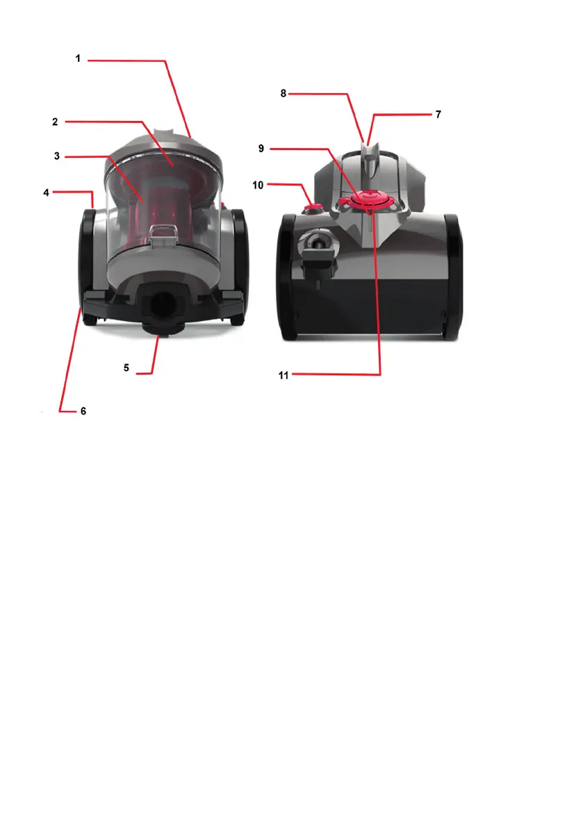 1. Deksel stofreservoir 7. Knop voor het losmaken van de vuilcontainer