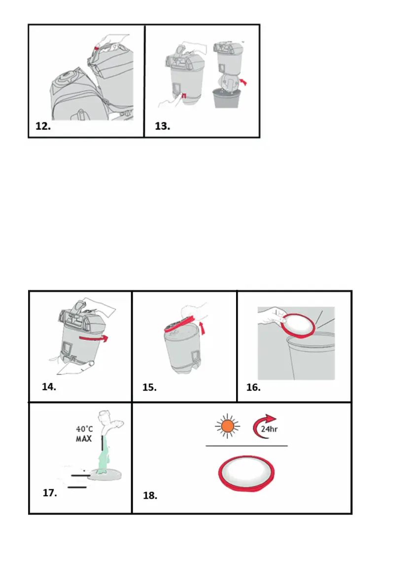 12. Press dirt container release button. Lift to remove dirt