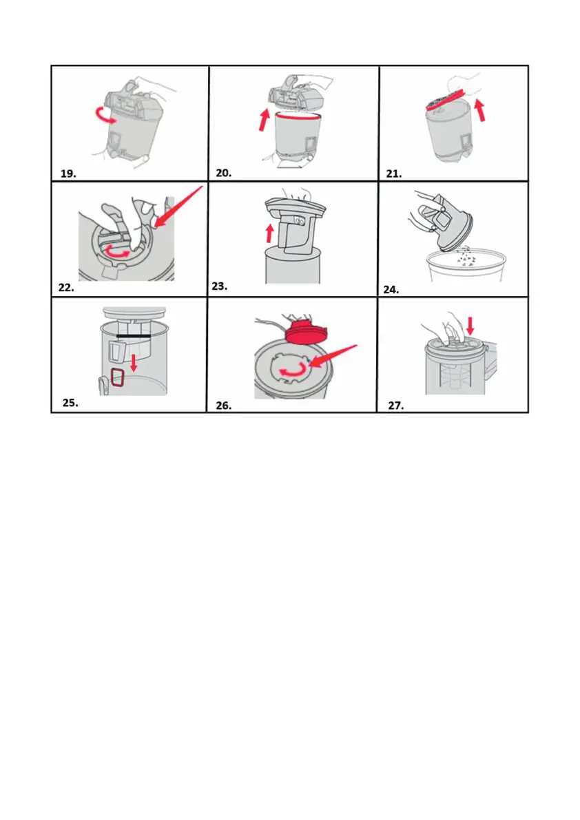 19. Sujete el depósito de polvo y gire la tapa en sentido contrario a las