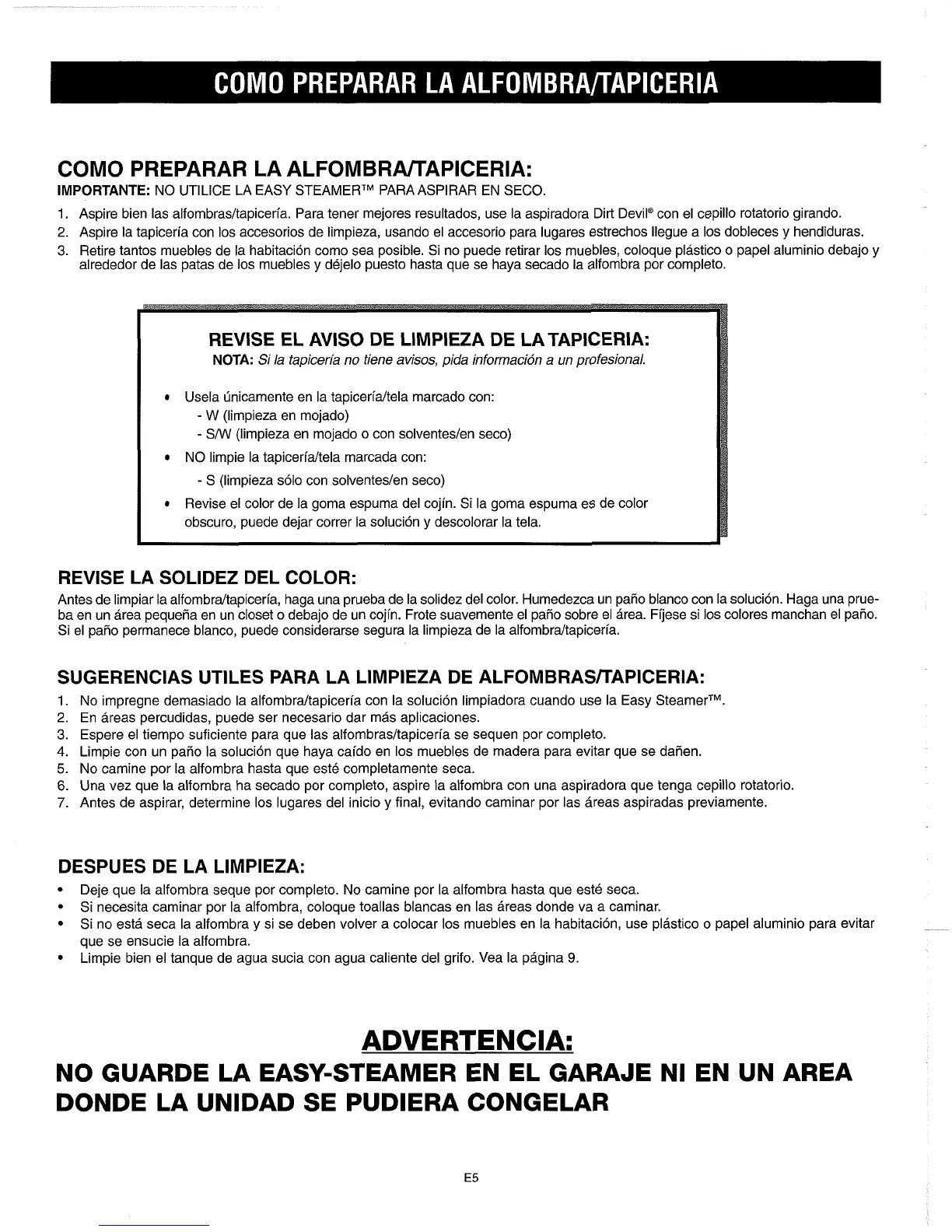 NO GUARDE LA EASY-STEAMER EN EL GARAJE NI EN UN AREA