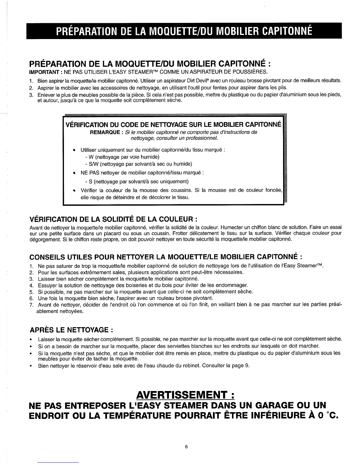Ne pas saturer de trop la rnoquettelle mobilier capitonne de solution de nettoyage lors de I'utilisation de I'Easy SteamerTM.
