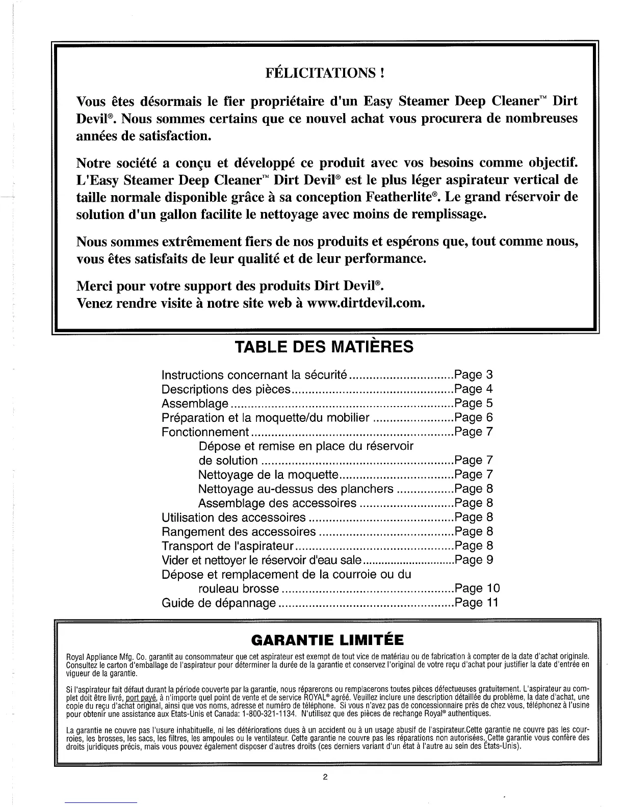 Royal Appliance Mfg. Co. garantit au consomrnateur que cet aspirateur est exempt de tout vice de materiau ou de fabrication