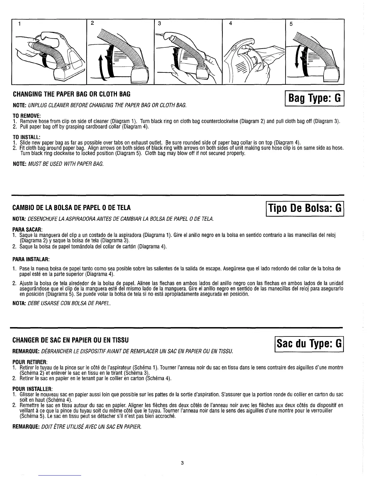 UNPLUG CLEANER BEFORE CHANGING THE PAPER BAG OR CLOTH BAG.