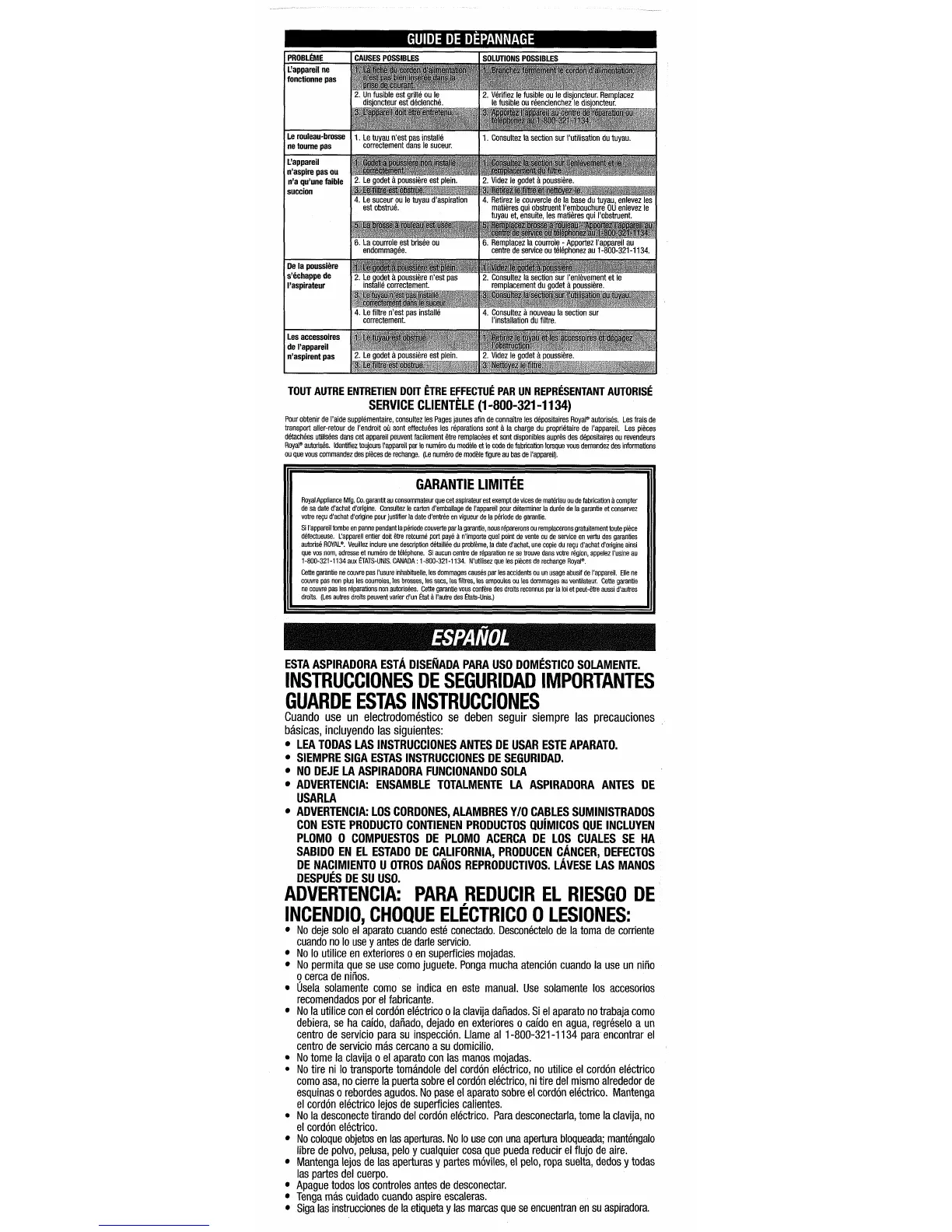 Royal Appliance Mfg. Co. garantit au consommateur que cet aspirateur est exempt de vices de materiau ou de fabrication