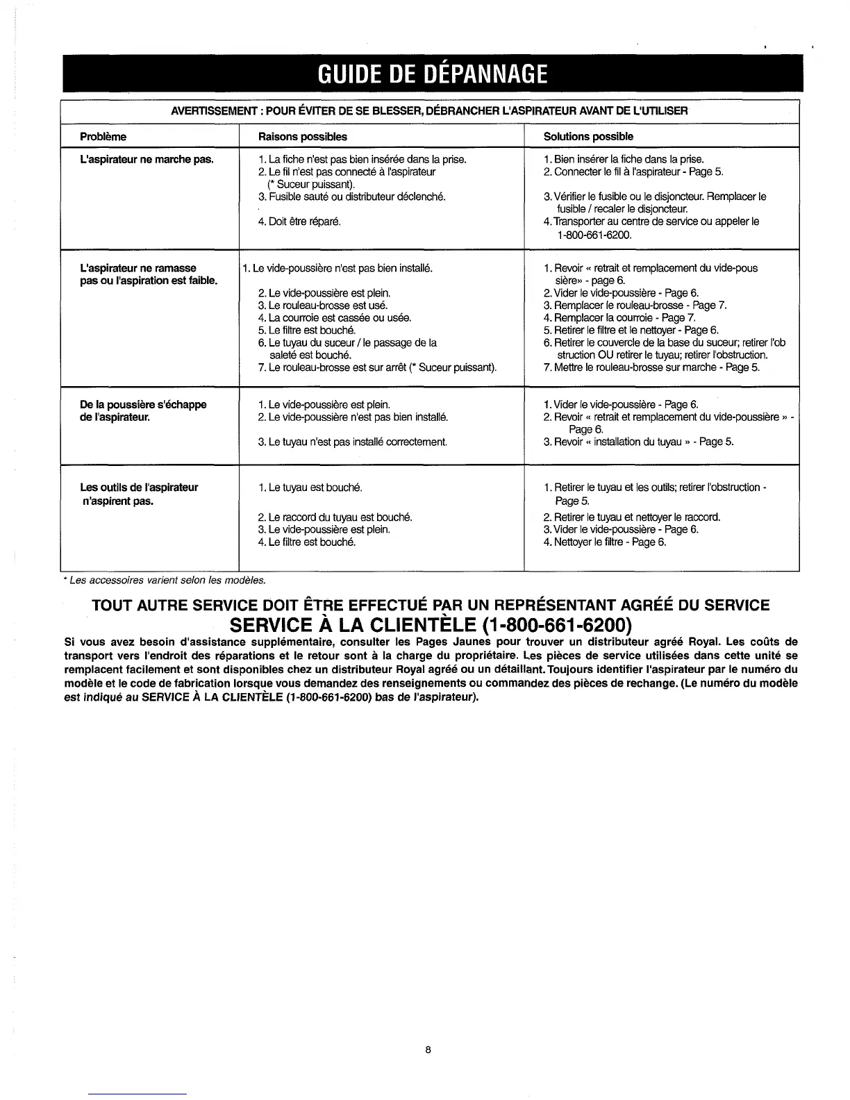 CLIENTELE (1-800-661-6200) bas de I'aspirateur).
