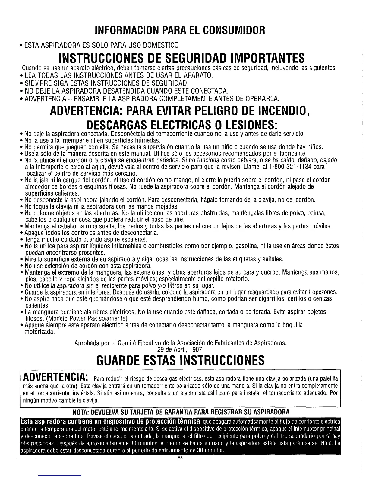 NOTA: DEVUELVA SU TARJETA DE GARANTIA PARA REGISTRAR SU ASPIRADORA