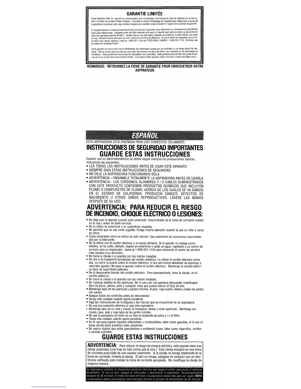 Royal Appliance Mfg. Co. garantit au consommateur que cet aspirateur est exempt de vices de materiau ou de fabrica-