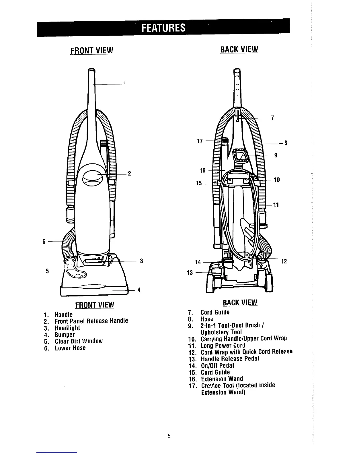 Dirt Devil M085610 - Features; Front View Features; Back View Features