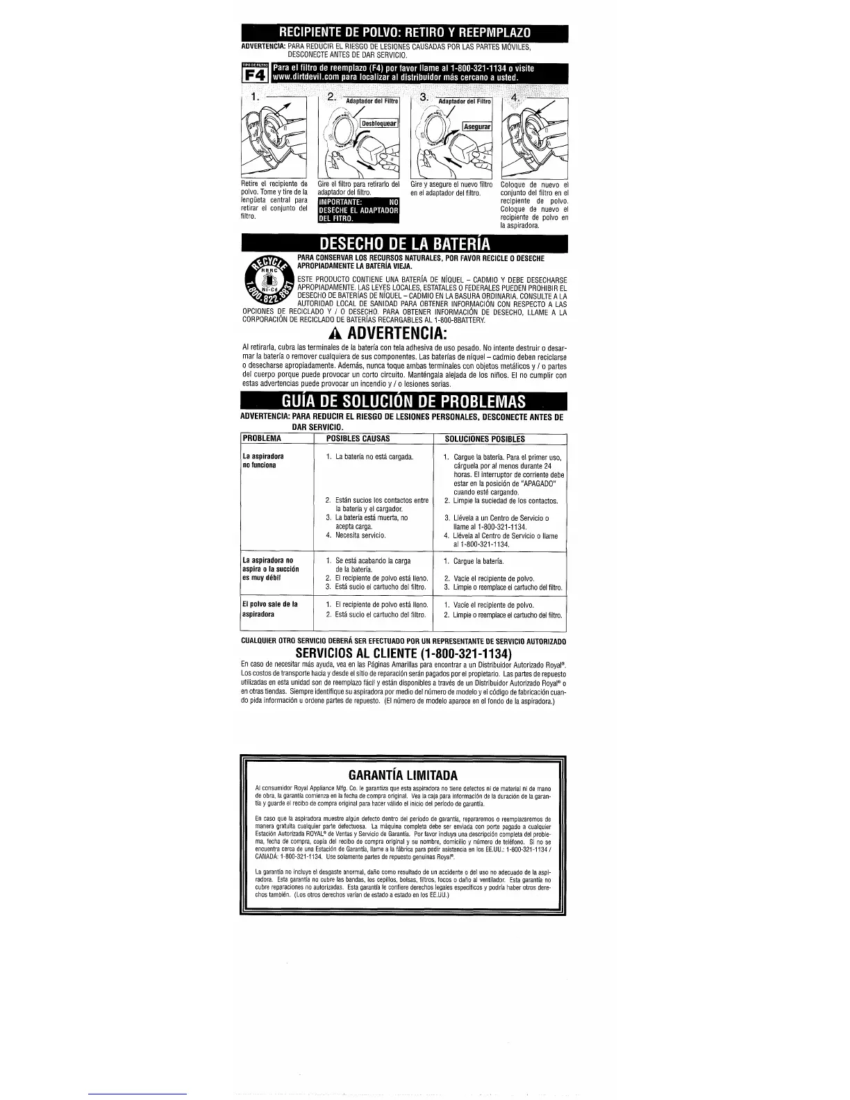 Al consumidor Royal Appliance Mfg. Co. le garantiza que esta aspiradora no tiene defectos ni de material ni de rnano