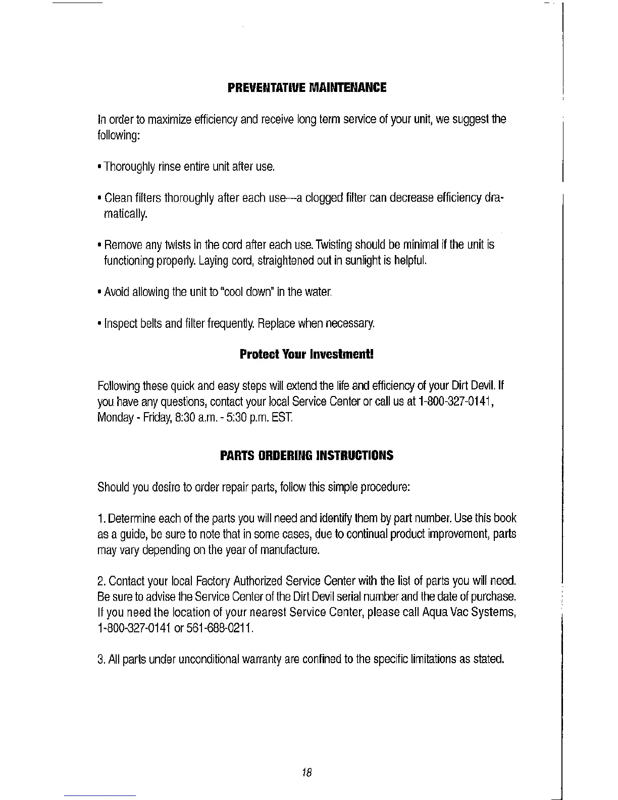 Dirt Devil Plus - Preventative Maintenance; Parts Ordering Instructions