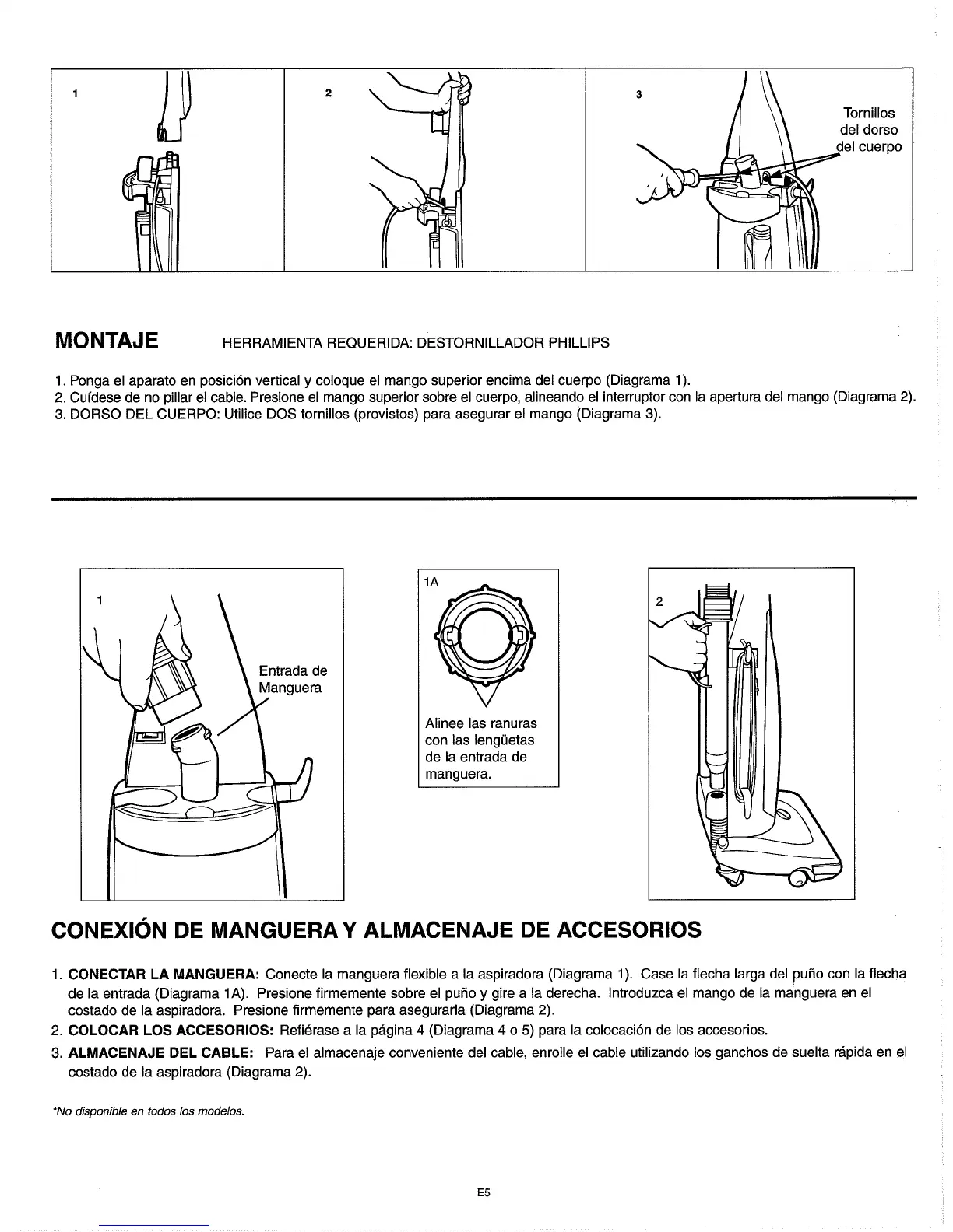 1. CONECTAR LA MANGUERA: Conecte la manguera flexible a la aspiradora (Diagrama 1). Case la flecha larga del pufio con la flecha