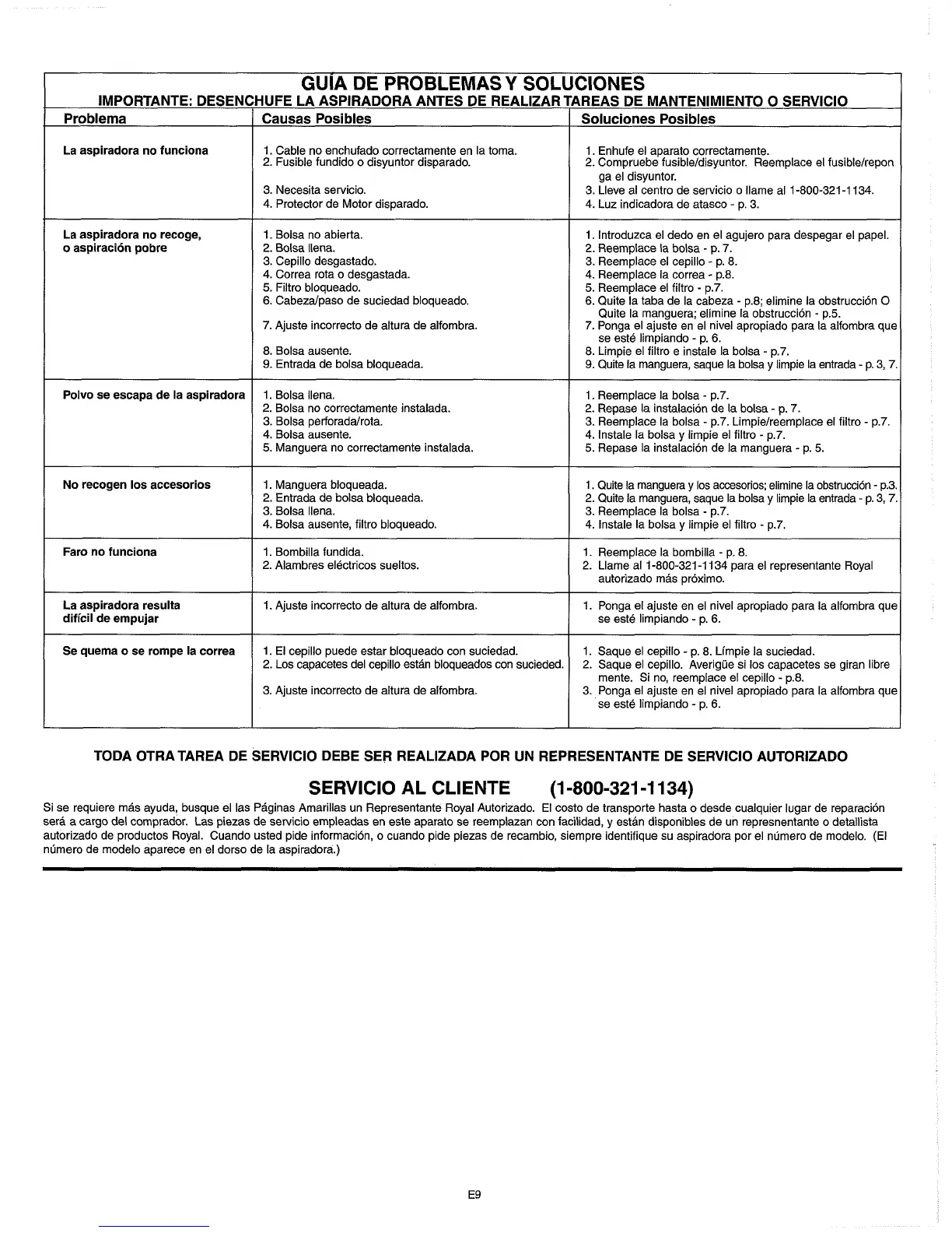 Si se requiere mas ayuda, busque el las Paginas Amarillas un Representante Royal Autorizado. El costo de transporte hasta o desde cualquier lugar de reparacion