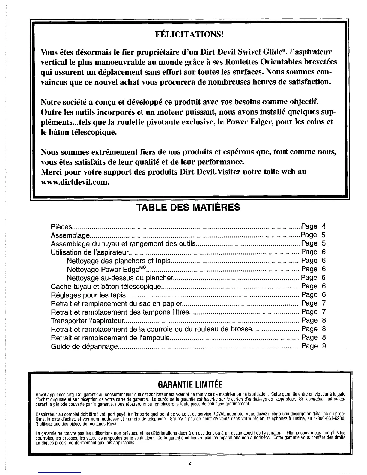 Vous ctes d6sormais le fier propridtaire d'un Dirt Devil Swivel GlideB, l'aspirateur