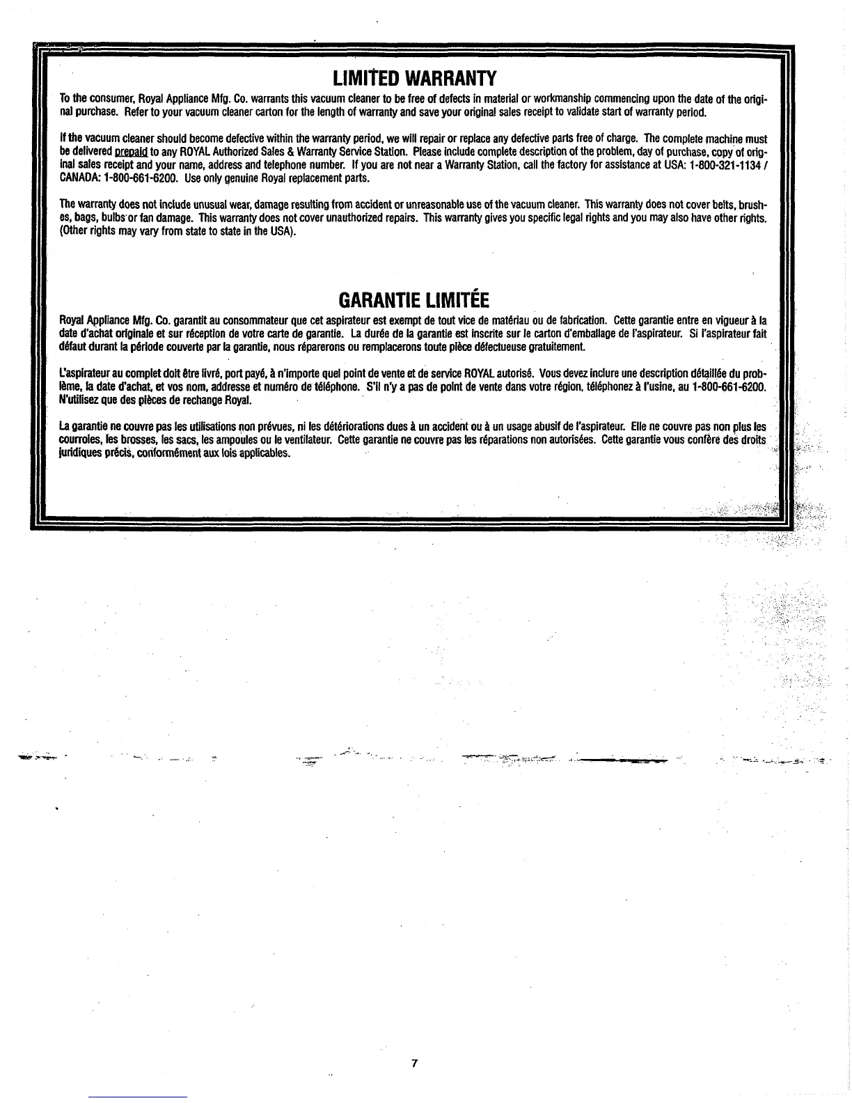Royal Appliance Mfg. Co. garantit au consommateur que cet aspirateur est exempt de tout vice de matbriau ou de fabrication. Celte garantie entre en vigueur
