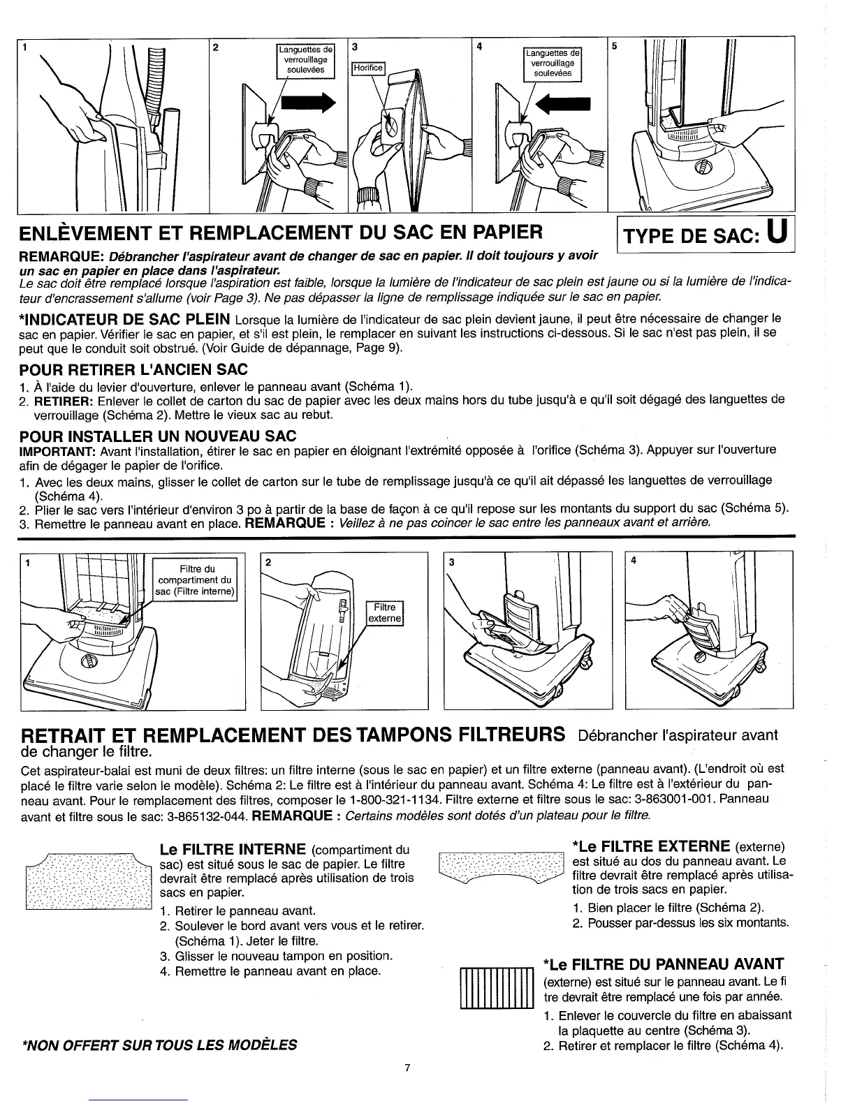 neau avant. Pour le remplacement des filtres, composer le 1-800-321-1 134. Filtre externe et filtre sous le sac: 3-863001-001. Panneau