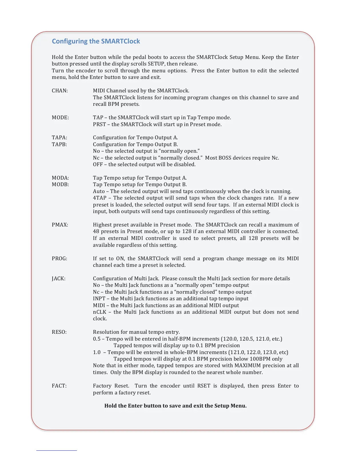 Hold!the!Enter!button!while!the!pedal!boots!to!access!the!SMARTClock!Setup!Menu.!Keep!the!Enter!
