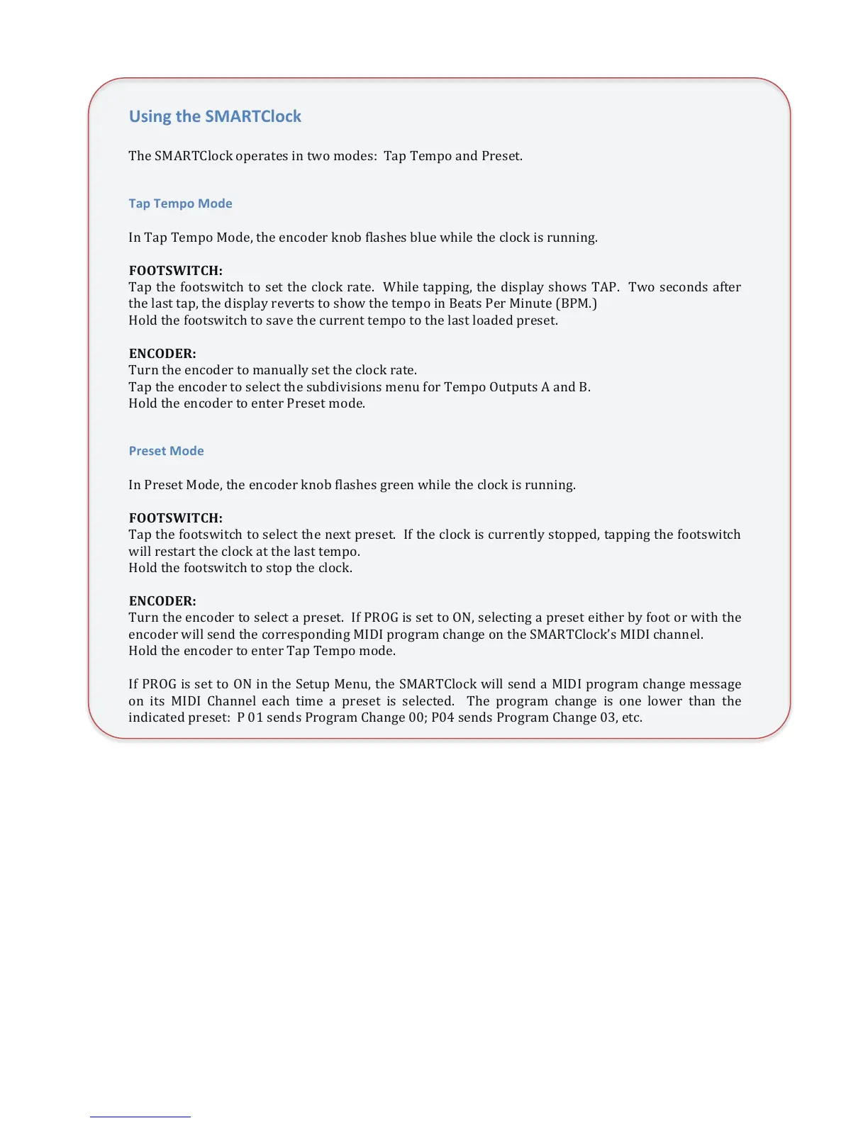 The!SMARTClock!operates!in!two!modes:!!Tap!Tempo!and!Preset.!