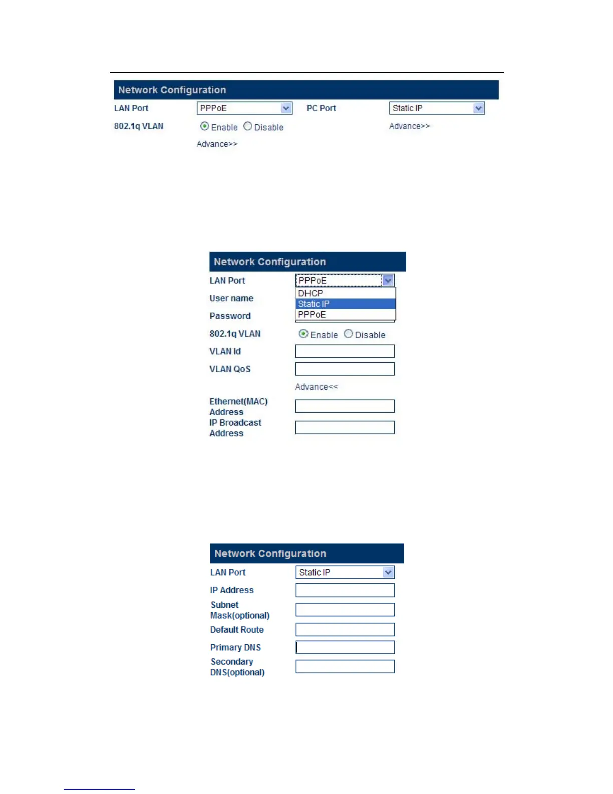 Three LAN Port modes are supported: DHCP, Static IP, PPPoE.