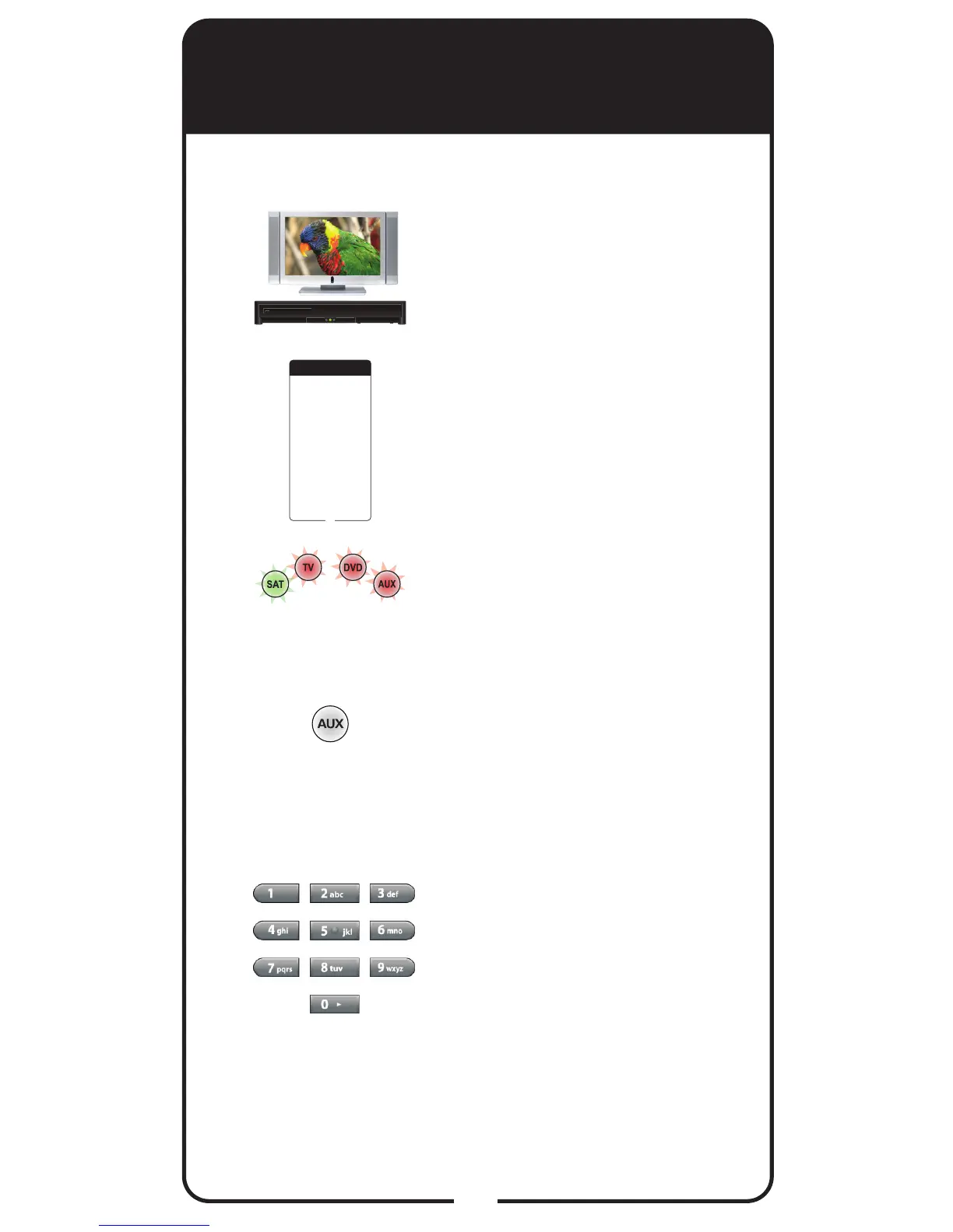 Note: If programming a second TV in AUX mode, press 0