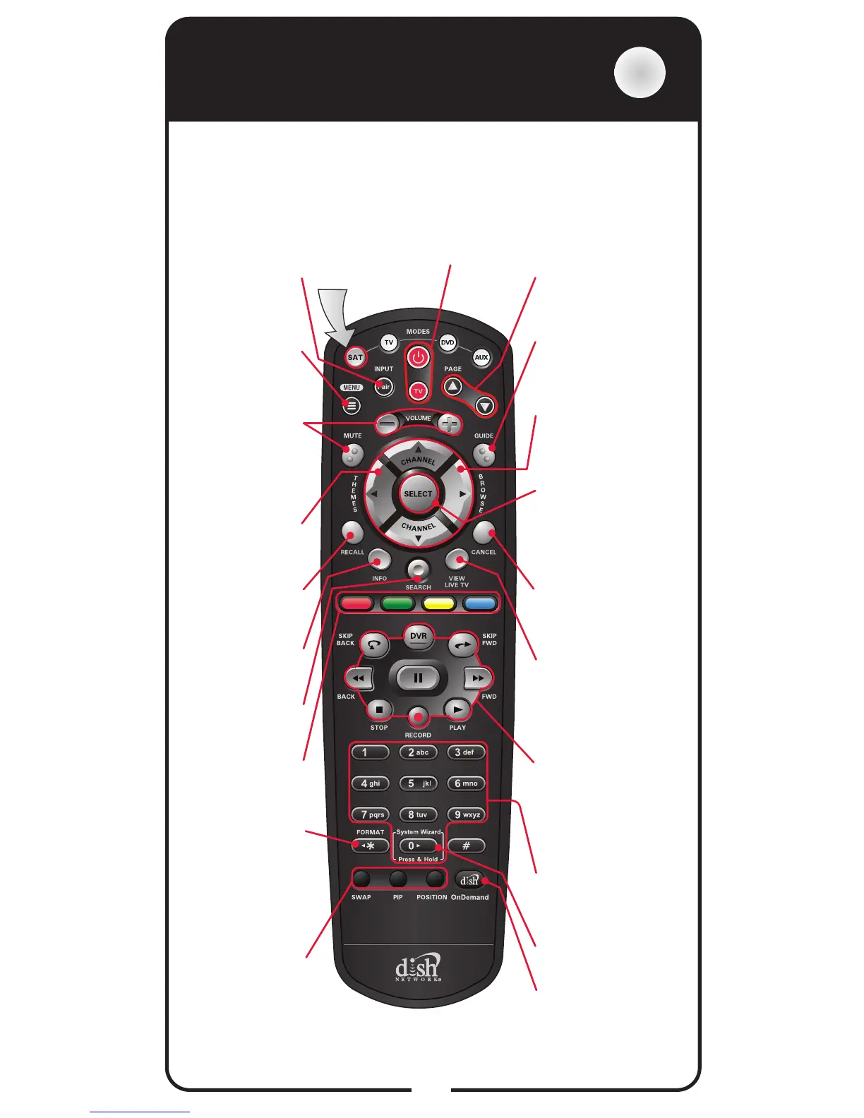 Dish Network 40.0 - SAT Mode Functions; Power, Input, Menu, and Navigation Controls; Volume, Mute, Program Guide, and Search Functions; DVR, Shortcut Keys, PIP, and OnDemand Features