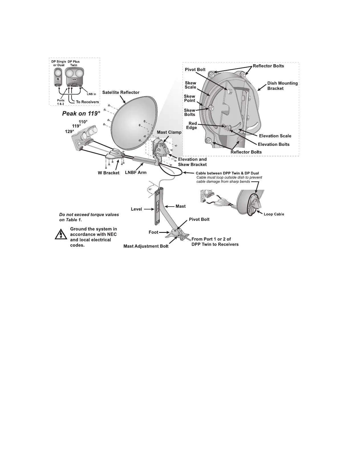 4. Assemble the dish antenna, setting the skew and elevation angles in the process (page 3, steps 4-6).