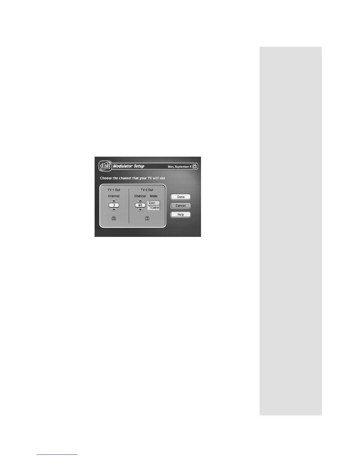 TV2 Out, select either Air (for off-air channel numbers) or Cable
