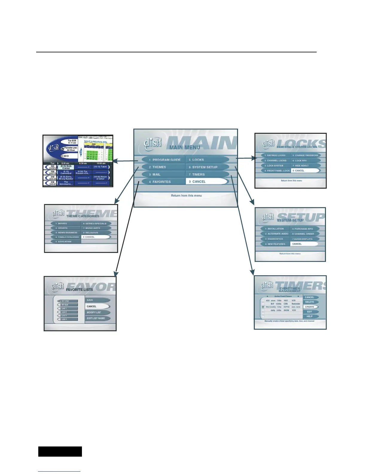 This diagram shows how the menus that the receiver displays on the television screen relate to one another.