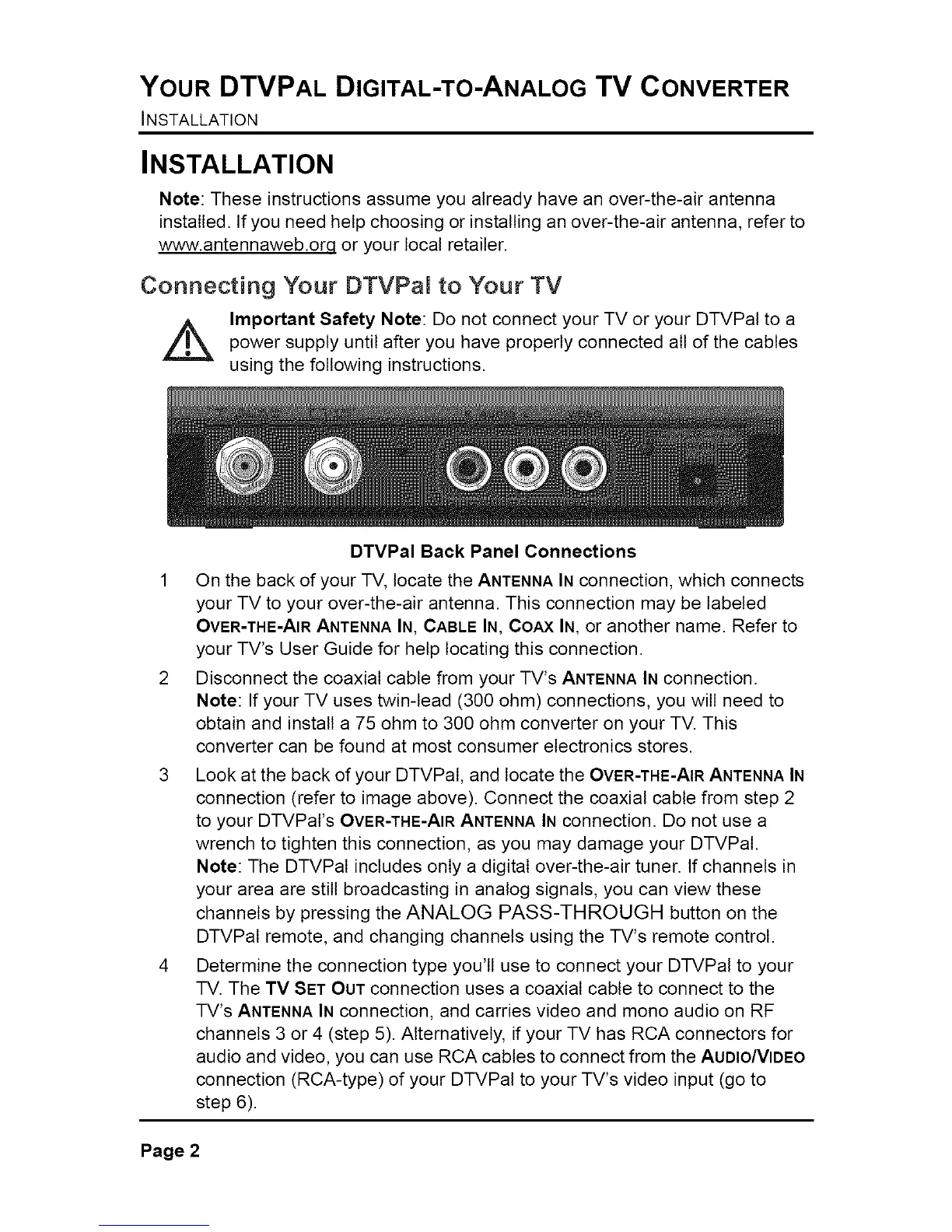 Important Safety Note: Do not connect your TV or your DTVPal to apower supply until after you have properly connected all of the cables