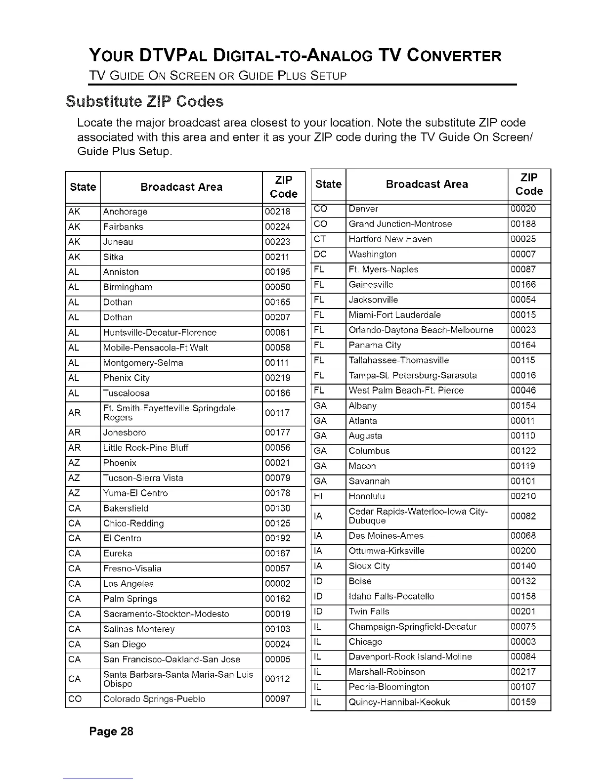 Locate the major broadcast area closest to your location. Note the substitute ZIP code