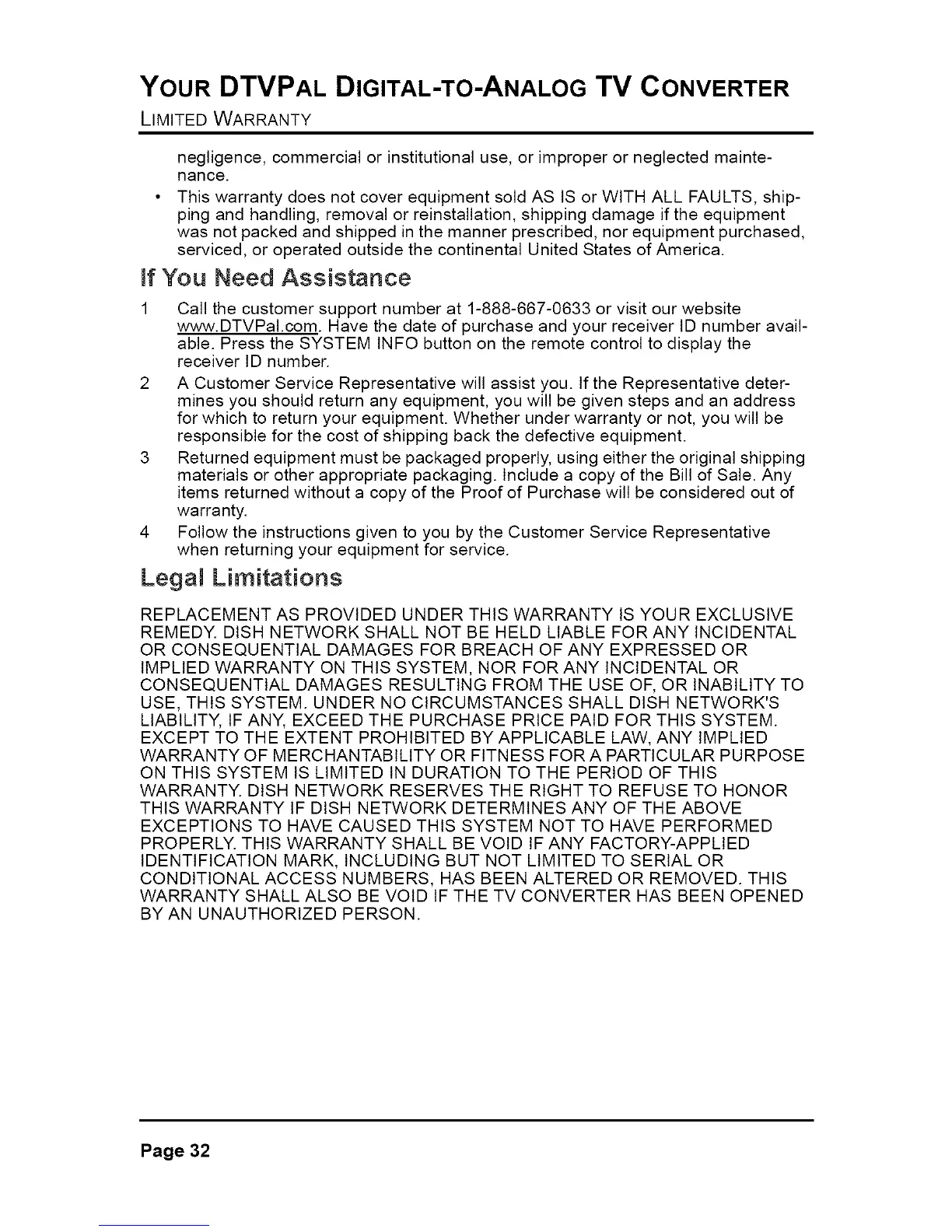 WARRANTY. DISH NETWORK RESERVES THE RIGHT TO REFUSE TO HONOR