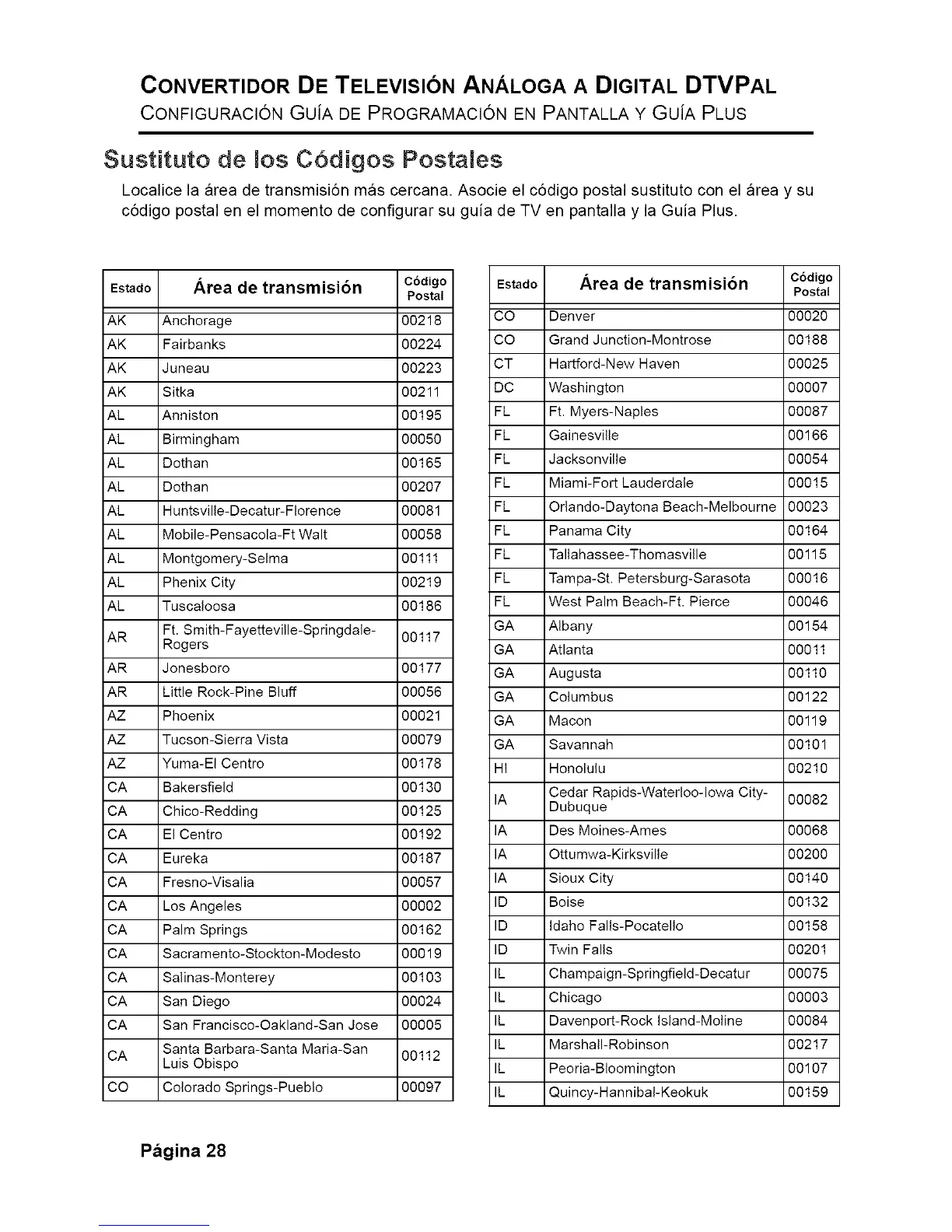 Localice la area de transmisi6n mas cercana. Asocie el c6digo postal sustituto con el area y su